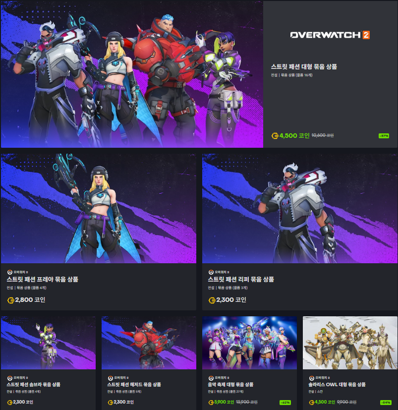 이번 업데이트에서는 트렌디한 스타일을 담은 ‘스트릿 패션 대형 묶음 상품’과 화려한 빛의 감각을 강조한 ‘솔라리스 OWL 대형 묶음 상품’이 함께 출시되었으며, 두 번들 모두 4,500 오버워치 코인에 구매할 수 있다.