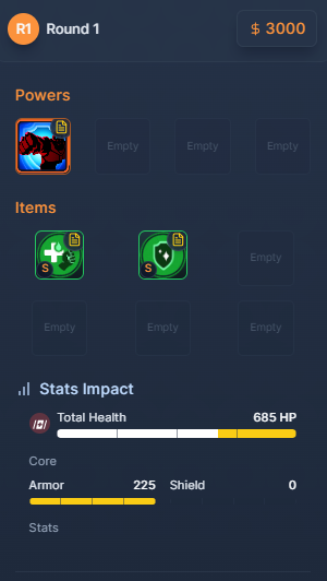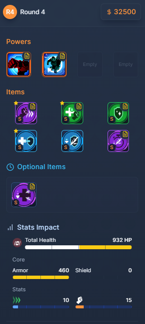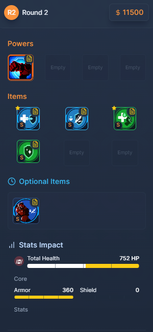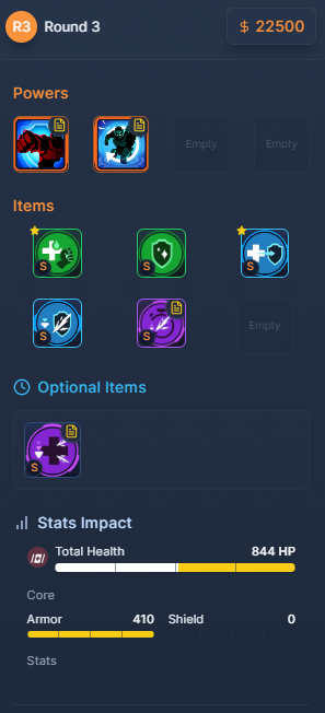 이 라운드에서는 [E 생명력]과 [성전사 유압 시스템]을 구매해 방어력 위주의 빌드로 나아간다. 이 아이템들은 생존력을 높이면서 동시에 피해량도 증가시킨다. 특히 [E 생명력]은 100의 방어력을 주며 [원시주먹]과 함께 근접 피해량을 20% 상승시킨다.