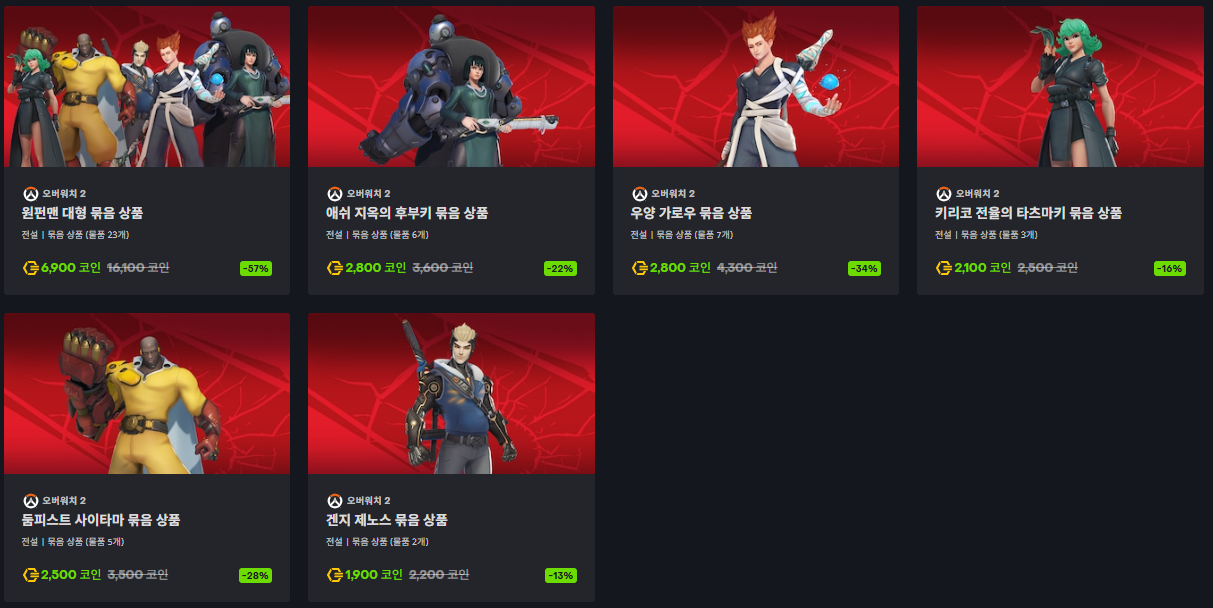 이번 상점 업데이트에서는 ‘원펀맨 대형 묶음 상품’이 6,900 코인에 판매되며, 원하는 영웅의 스킨만 개별 번들로 구매할 수도 있다.