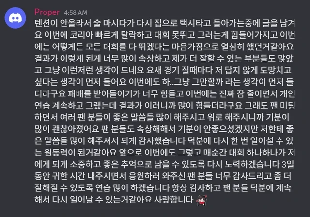 Proper은 “요즘 텐션이 안 올라서 술을 마시다가 택시를 타고 집에 돌아오는 길에 글을 남기게 됐다”며 “이번에 코리아에서 빠르게 탈락하고 대회를 뛰지 못한 게 많이 힘들었다”고 털어놨다. 이어 “이번에는 어떤 대회든 다 나가겠다는 마음으로 열심히 준비했는데, 결과가 이렇게 돼서 너무 속상하다”고 심경을 밝혔다.