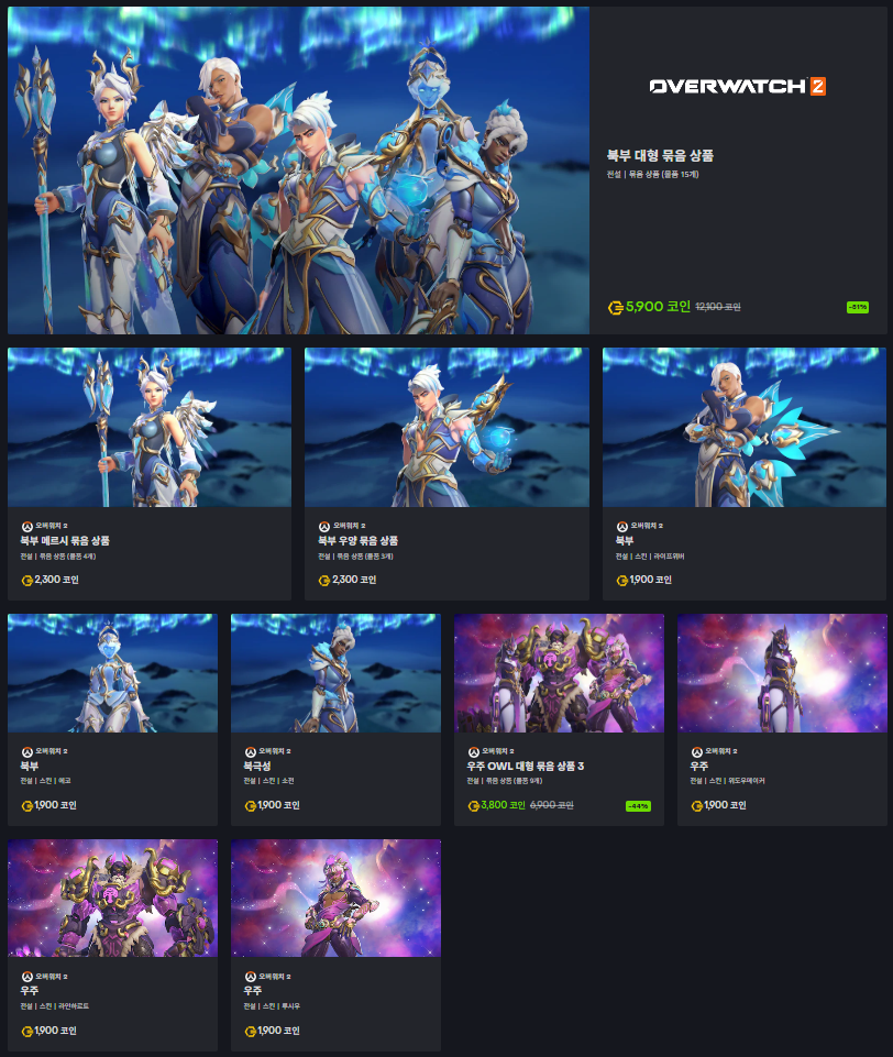 이번 상점 로테이션에서는 화려한 색감과 북극광 콘셉트를 담은 ‘북부대형 묶음상품’이 5,900 오버워치 코인에 판매되며, OWL 테마의 ‘우주 OWL 대형 묶음 상품’도 3,800 코인에 함께 출시됐다.