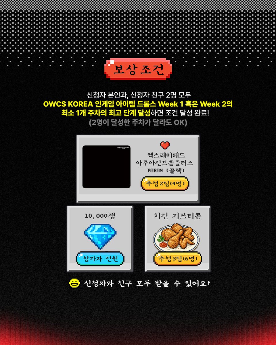 보상은 양측 모두 OWCS KOREA 인게임 아이템 드롭스 Week 1 또는 Week 2 중 최소 한 주차에서 최고 단계를 달성할 경우 지급된다. 단, 각자 다른 주차에서 조건을 달성하더라도 보상 지급 기준은 충족된다.