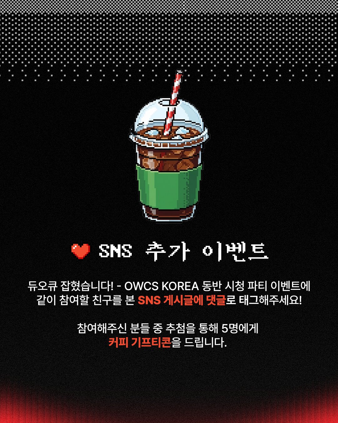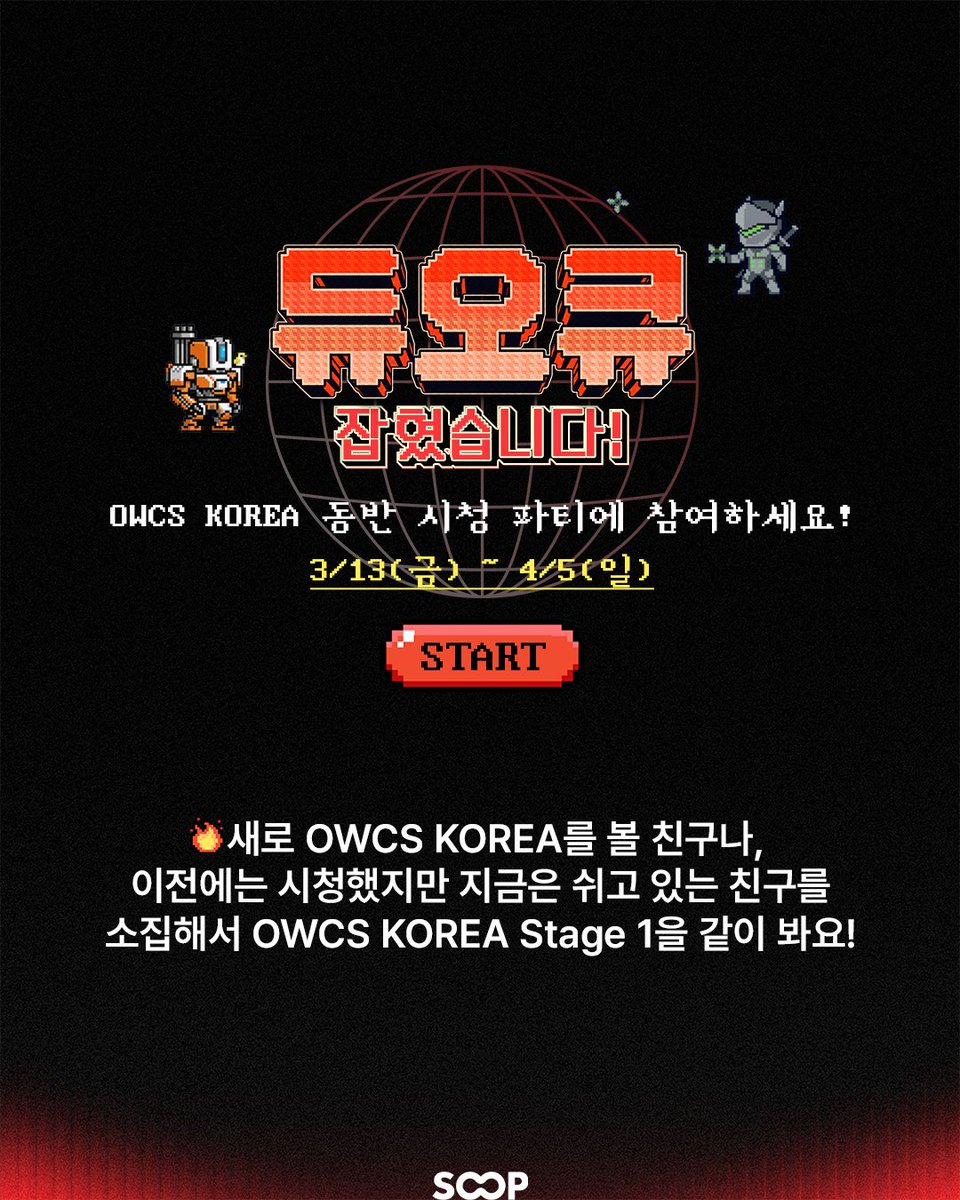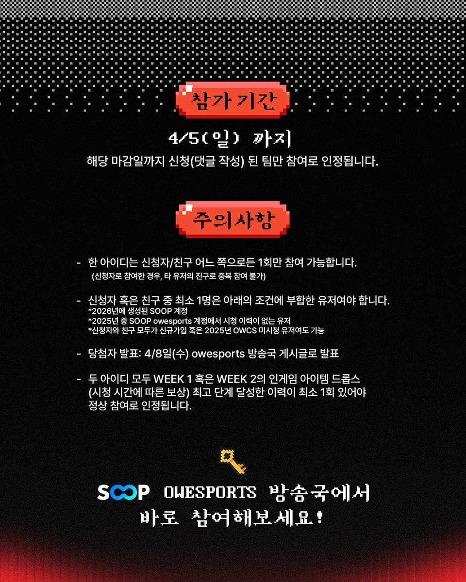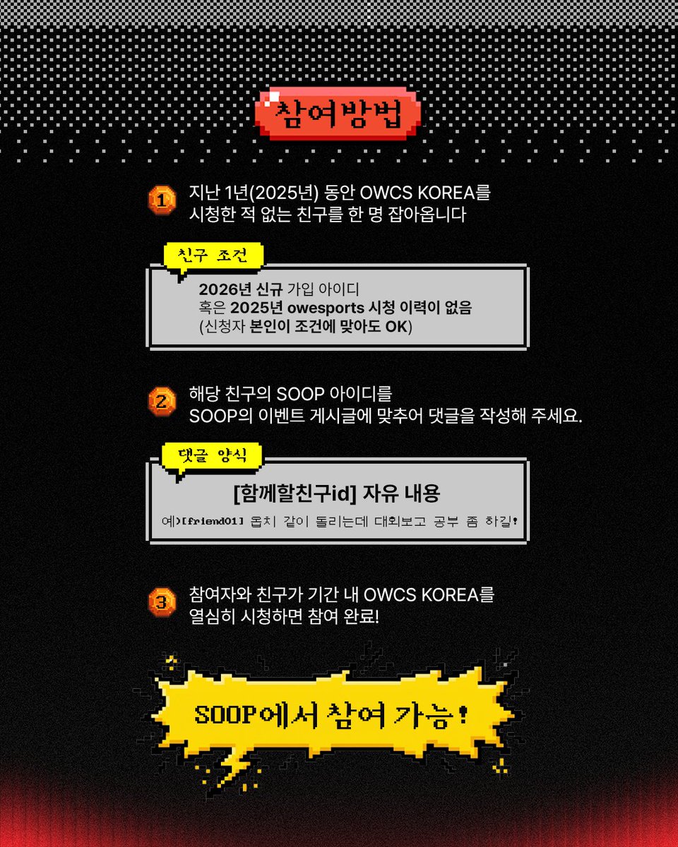 이벤트 참여자는 지난 2025년 동안 OWCS KOREA를 시청한 이력이 없는 친구를 초대한 뒤, SOOP 이벤트 게시글에 지정된 양식으로 댓글을 작성하면 된다. 이후 참여자와 친구가 이벤트 기간 내 꾸준히 OWCS KOREA 방송을 시청하면 참여가 완료된다.